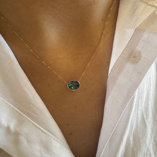 A modern classic, this semi-precious stone necklace in 14K yellow gold features a vibrant pop of color on a delicate cable chain. Weighing approximately 2.5 – 2.7 grams, it’s available in multiple stone options to match your style. Perfect for everyday wear, layering, or gifting, this versatile piece adds effortless elegance to any look.