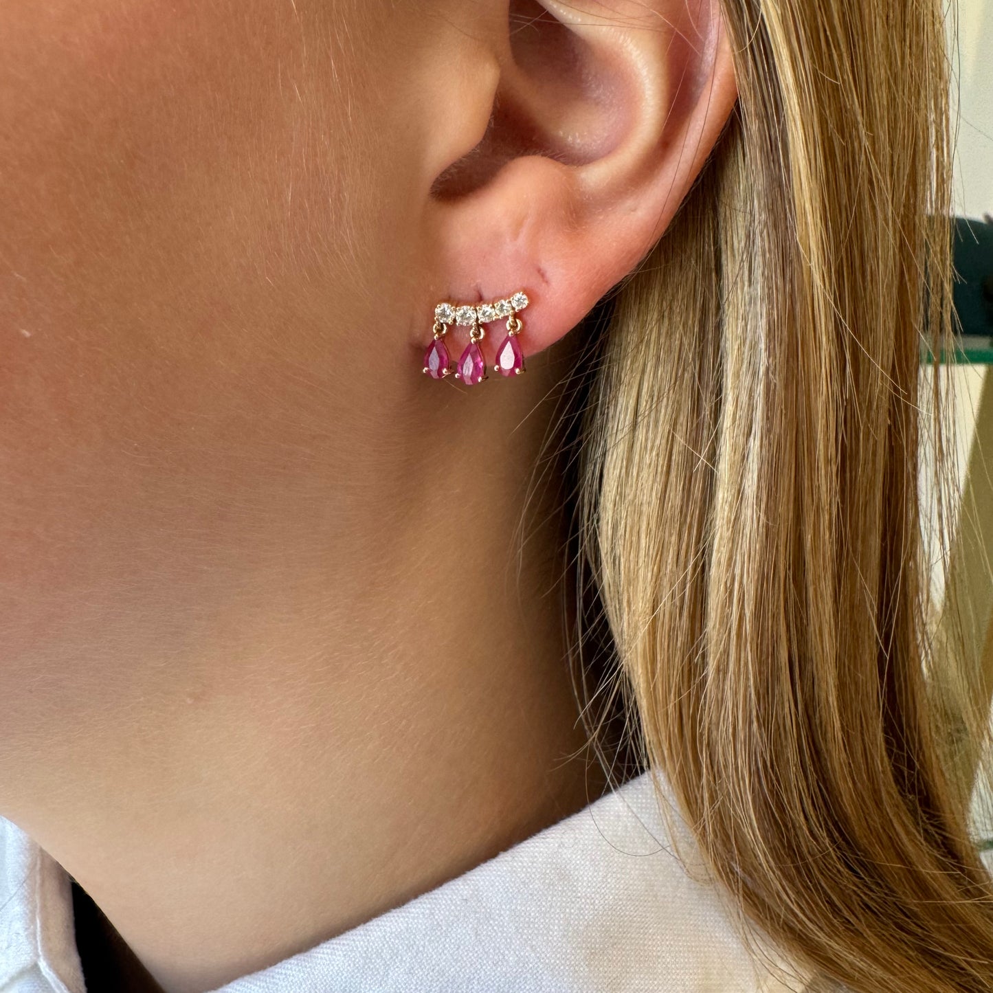 Diamond Bar & 3 Hanging Pear Shaped Rubies Earrings