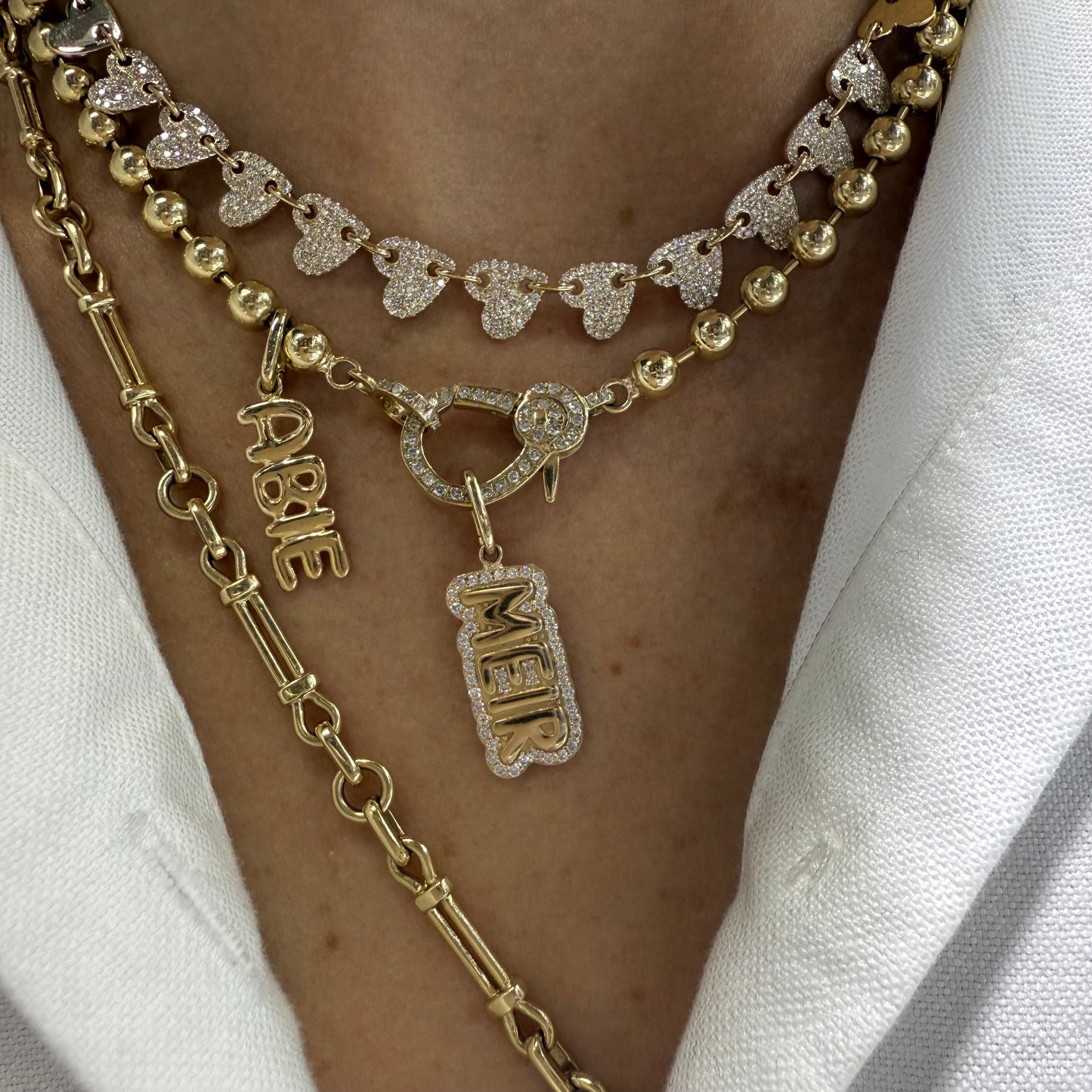 Bold and playful, this custom bubble name charm is crafted in 14K gold and set with natural diamonds for extra sparkle. Each piece is made to order in your chosen font and size, creating a truly personal design. A standout statement that blends fun style with fine craftsmanship.