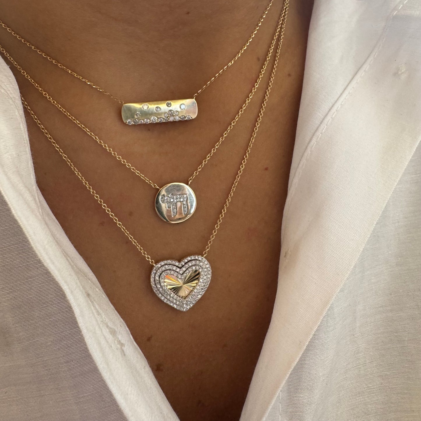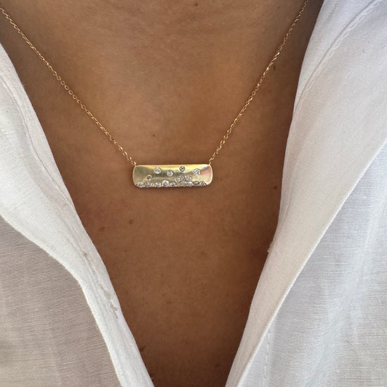 Delicate and dazzling, this bar necklace features scattered diamonds for a subtle sparkle. It’s a versatile and elegant piece that’s perfect for layering or wearing on its own.